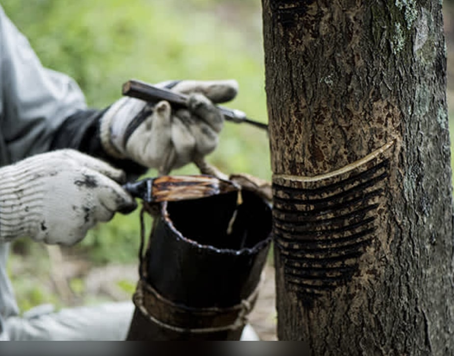 Récoltée en Asie durant l'été par incision des troncs, elle est filtrée puis longuement brassée à la main pour homogénéiser sa texture. Ce processus artisanal, appelé « nayashi » est garanti sans aucun produit chimique.